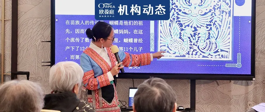 4月9日,上海对外经贸大学“苗绣出海”项目团队师生来到欧葆庭顾村国际颐养中心开展苗绣文化宣讲会,介绍苗族历史、苗绣图案、苗绣制品等内容,并在现场举办了苗绣作品展览,和长辈们积极互动。欧葆庭中国CEO柯烨明先生出席宣讲会,并表达了对“苗绣出海”项目团队的关注与支持。
