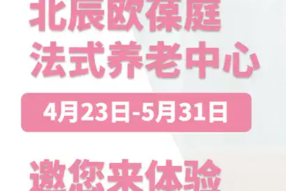五月到来之际北辰欧葆庭国际颐养中心特推出‘’五月荣光,共赏春光劳有所获,老有所依”体验月活动赶快来看一看吧!活动期限:2021/04/23-2021/05/3101 免费参观送营养餐+伴手礼体验内容:免费预约参观,可领取营养餐券2张+精美伴手礼1份申请条件:年满65周岁长辈,到访