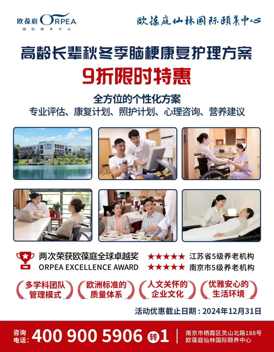 随着秋冬的到来,脑梗的高发也与之伴随。脑梗已成为危害长者晚年生活健康的“头号隐患”。面对突发脑梗或是有心血管方面的高龄长辈的康复及照护,欧葆庭仙林国际颐养中心现在特别推出高龄长辈秋冬季脑梗康复护理方案,9折限时优惠。
