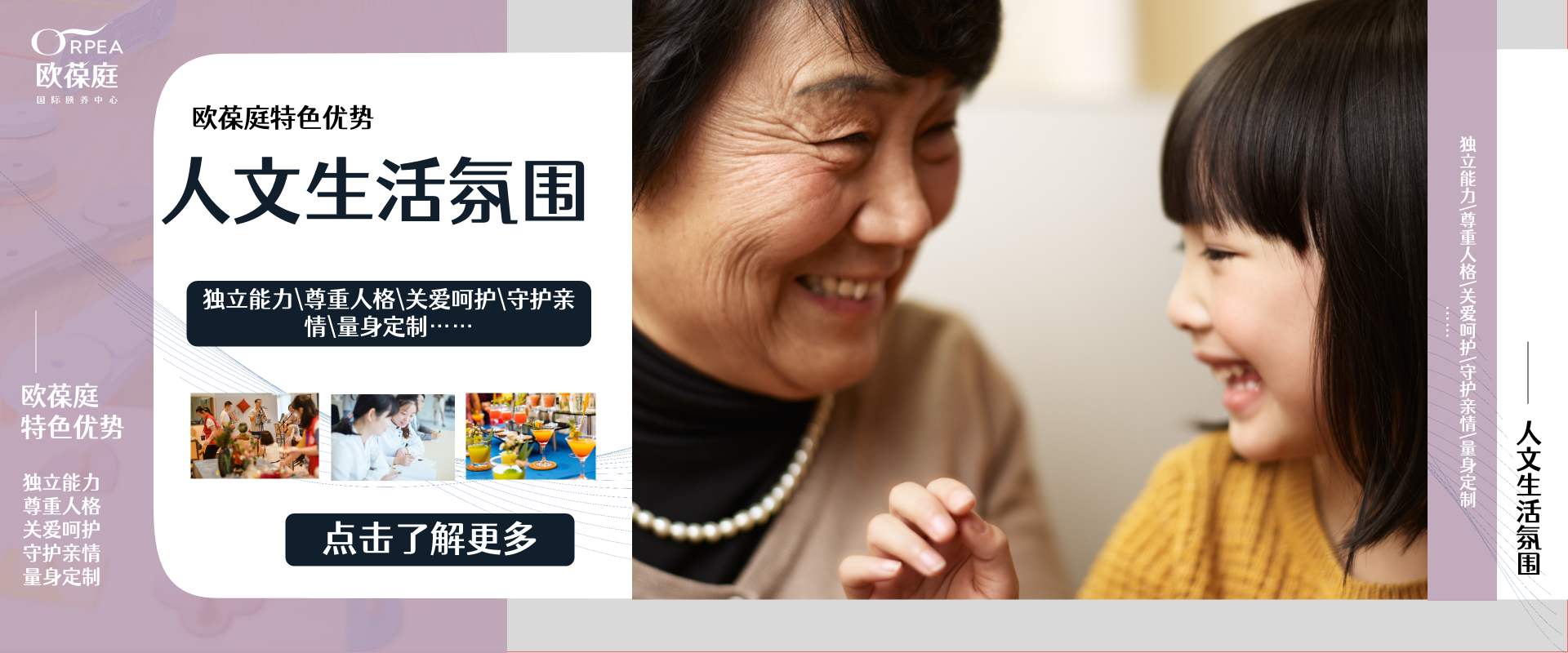 关注长辈:以长辈为中心,以家庭为纽带,全面照顾长辈的生活起居,给予所需的医护支持。充分尊重长辈意愿,呵护长辈的身心健康。我们以“欧葆庭·好心情”为目标,拓展四大社区文化板块:中西交融 焕发潜能 亲其所爱 社会责任,充分满足长辈的精神文化需求。