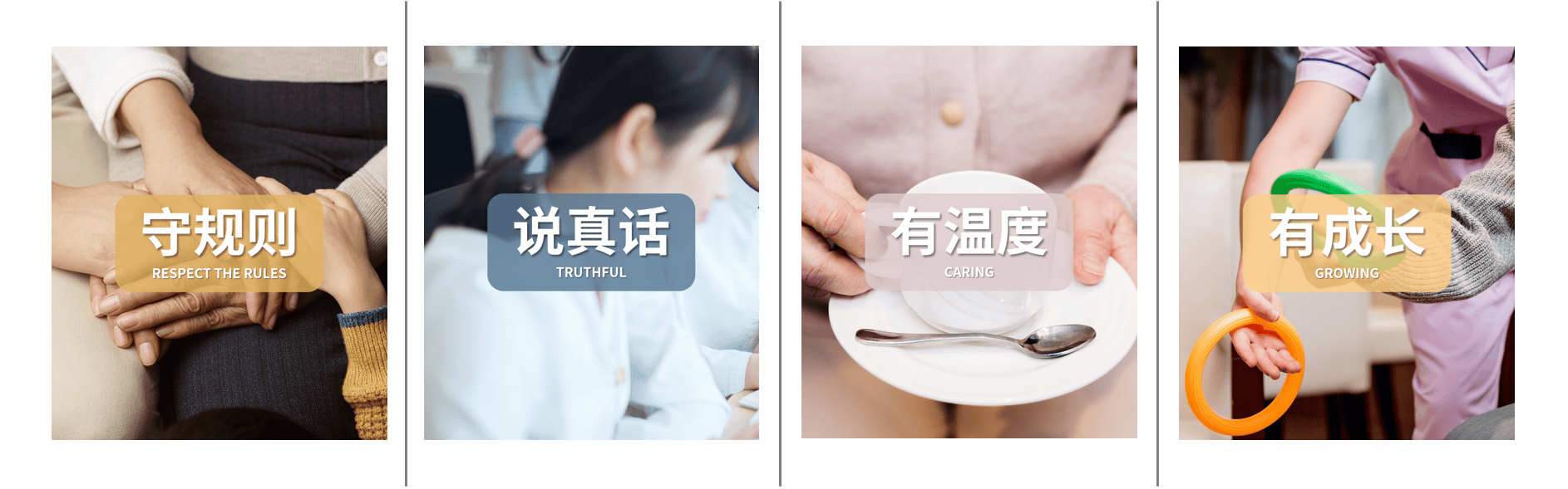 高效的工作空间设计、专业培训和心理支持,保障护理人员的工作环境最优化。高度重视。职业道德与敬业精神,关注员工的身心健康与职业发展。中国区员工文化:守规则 说真话有温度 有成长